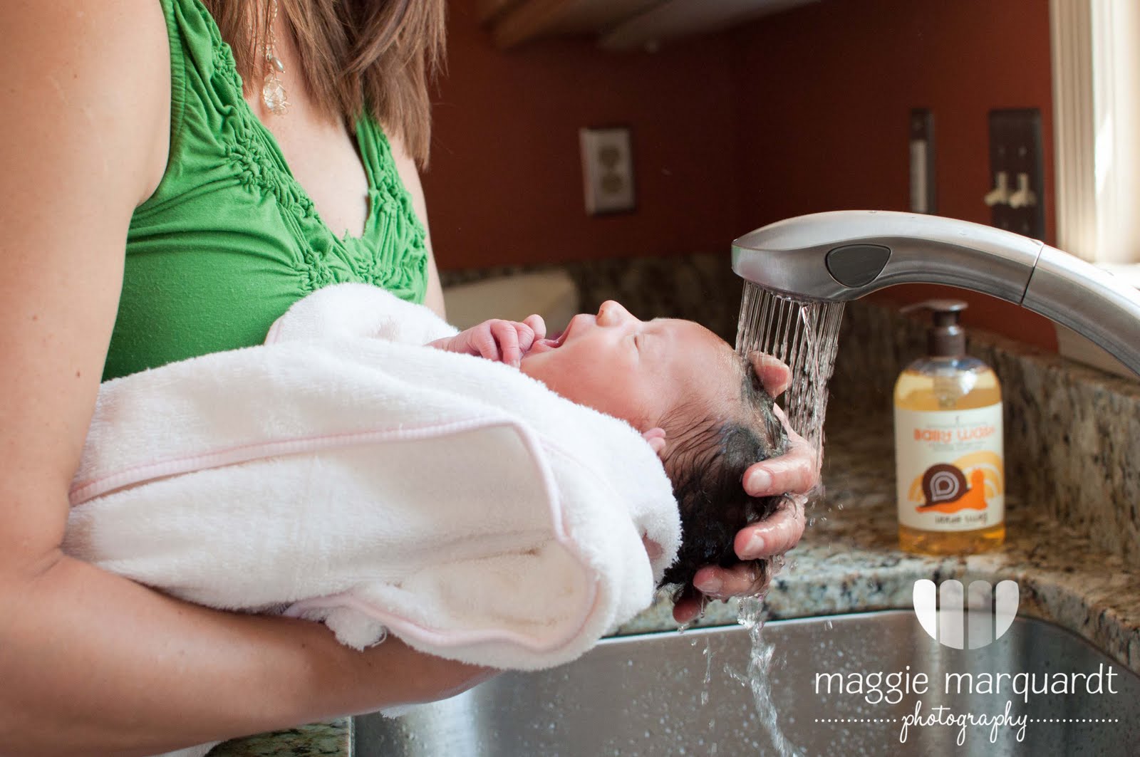 After ooh-ing and aah-ing my hellos, I got to capture a few moments of baby M's first bath as she got ready for her big photo shoot. Following some snuggles from her mama and a quick feeding, she was simply a doll to photograph. So mellow and stunning with all of that dark hair! When big sister A was up from her nap and ready for action, we snapped away to try to catch a bit of sisterly love :)